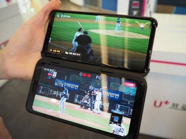 마츠모토 편집장은 LG유플러스 직영 매장을 소개하며, 아이돌 가상현실(VR) 콘텐츠, 야구와 골프를 다각도에서 볼 수 있는 중계 서비스, 게임 등 5G를 위한 독자 컨텐츠로 새로운 즐거움을 어필하고 있었다고 말했다. 사진은 LG전자의 듀얼 스크린 스마트폰. 두개의 화면에서 동영상을 봐도 고속 대용량의 5G에서는 쾌적하게 즐길 수 있다.